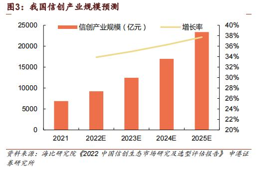 有券商认为,新政要求央企国企落实信创全替代,未来五年是信创发展的关键时期,发展空间广阔,预计年末将有信创行业的大规模招标。2021年我国信创产业规模为6886.3亿元,随着自主创新进程的深入和应用场景的扩大,根据海比研究院报告,接下来五年信创市场进入高速发展期,预计2025年信创产业规模将突破2万亿。