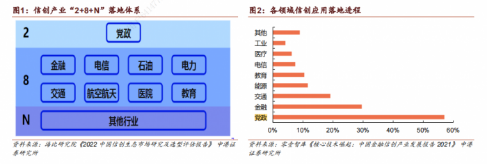 在应用领域方面,党政走在信创落地最前列,形成了“2+8+N”落地体系。截至2021年末,党政信创落地实践率达到57.01%。八大行业中,金融和交通进展最快,落地实践率分别为29.55%和19.10%。能源、电信、航空航天、教育、医疗也在逐步进行政策推进和试点。最后,信创将在N个行业全面推广。