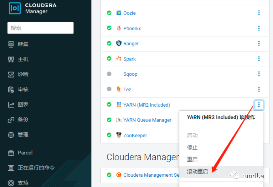 CM主页 > 点击“YARN (MR2 Included) ”后面的... > 滚动重启,其它界面均默认,稍等片刻,完成重启。