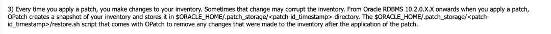 随后日志中提到需要到"/u01/app/12.2.0/grid/.patch_storage/NApply/2022-08-13_17-52-43PM"这个目录下,执行restore脚本来修复这个报错的影响(即还原GI_HOME)。首先要确认报错的原因,其次需要将该节点环境恢复好,以便重新应用补丁。关于报错原因,mos文档中《error retrieving current directory: getcwd: cannot access parent directories: No such file or directory (Doc ID 1475219.1)》描述与此次报错匹配,如下图:==》发生这种情况是因为执行命令的 shell 的当前目录已被删除或被重新创建。为了避免再次报错的方式就是换个目录再发起命令。另外,该节点因报错,导致节点无法正常拉起,而且软件也有更新,如下图:报错日志中提到需要执restore.sh脚本来还原GI_HOME。关于restore.sh在mos文档《Can You Delete $ORACLE_HOME/.patch_storage Directory ? (Doc ID 403218.1)》中有描述,如下图:==》大致意思是restore.sh可以移除当前inventory的变更。因在文档中未找restore.sh可以还原GI_HOME的字样,笔者考虑到打补丁时间以及执行restore.sh会不会有其它影响,所以就未采用日志中提到的执行restore.sh脚本。而是采用打补丁之前软件的冷备,进行解tar来恢复整个oracle目录。整个oracle目录压缩备份下来有20G,解tar还原过程也就20分钟。随后,换个目录重新调用opatchauto命令,这次补丁更打成功了。总结: