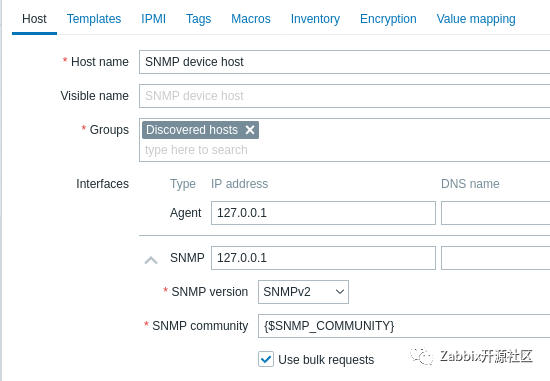 您可以使用zabbix提供的任意 SNMP 模板(SNMP 设备模板和其他模板),该模板将自动添加监控项。但是,那模板可能与主机不兼容。点击 Add 保存主机。
