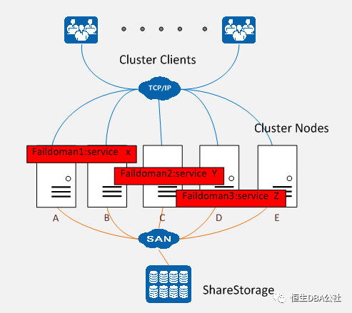 完全共享的存储子系统:所用集群成员都可以访问同一个存储子系统。