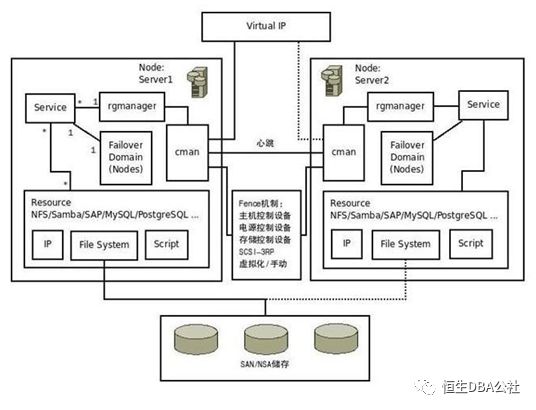 服务(service):在RHCS中服务是一堆资源的组合,而不是通常我们指的单一服务器软件。服务是有IP Resource(service ip,对外提供服务的IP)、Application 资源Resource(就是集群上所提供的服务)、File System Resource所组成。