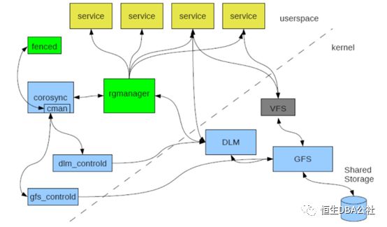 DLM: DistributedLockManager是一个分布式锁管理器,它是RHCS的一个底层基础构件,同时也为集群提供了一个公用的锁运行机制。DLM运行在每个节点上GFS通过锁管理器的机制来同步访问文件系统的元数据。CLVM通过锁管理器来同步更新数据到LVM卷和卷组。DLM不需要设定锁管理服务器,它采用对等的锁管理方式,大大提高了处理性能。同时,DLM避免了单个节点失败需要整体恢复的性能瓶颈。另外,DLM的请求是本地的,不需要网络请求,因此请求会立即生效。最后,DLM通过分层机制,可以实现多个锁空间的并行锁模式。