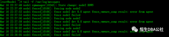 命令:tail -f var/log/messages,可以看出node2节点fence失败