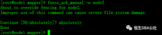 命令:fence_ack_manual -n node2(注:node2为节点名称),手动fence,提示是否继续回复absolutely即可。