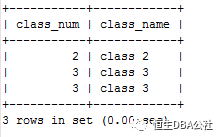 在这里class_num 等于3的记录重复了,而我们这时候只需要知道有哪些课程有学生参加了,并不需要知道有多少个学生参加,所以这里的重复记录对我们来说并没有意义。虽然我们可以用distinct来去重,但这显然会影响性能,这时候我们就可以用到子查询了。