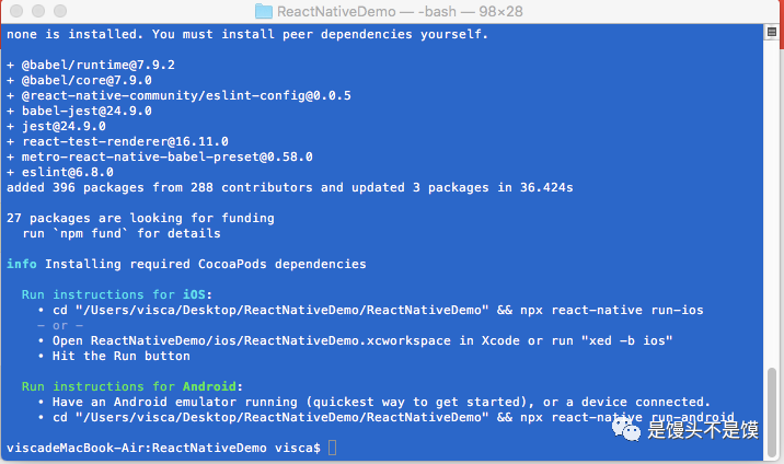 我用的名称是ReactNativeDemo。成功后终端给出了针对iOS和Android的运行指引,按照这些命令操作就可以跑起来了~
