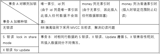 此时事务B若对相同行的数据(即id=2这行数据)做S锁读、X锁读、Update操作会遵循S、X锁兼容性规则,而由于id列是唯一索引,因此插入任何数据都不会阻塞。