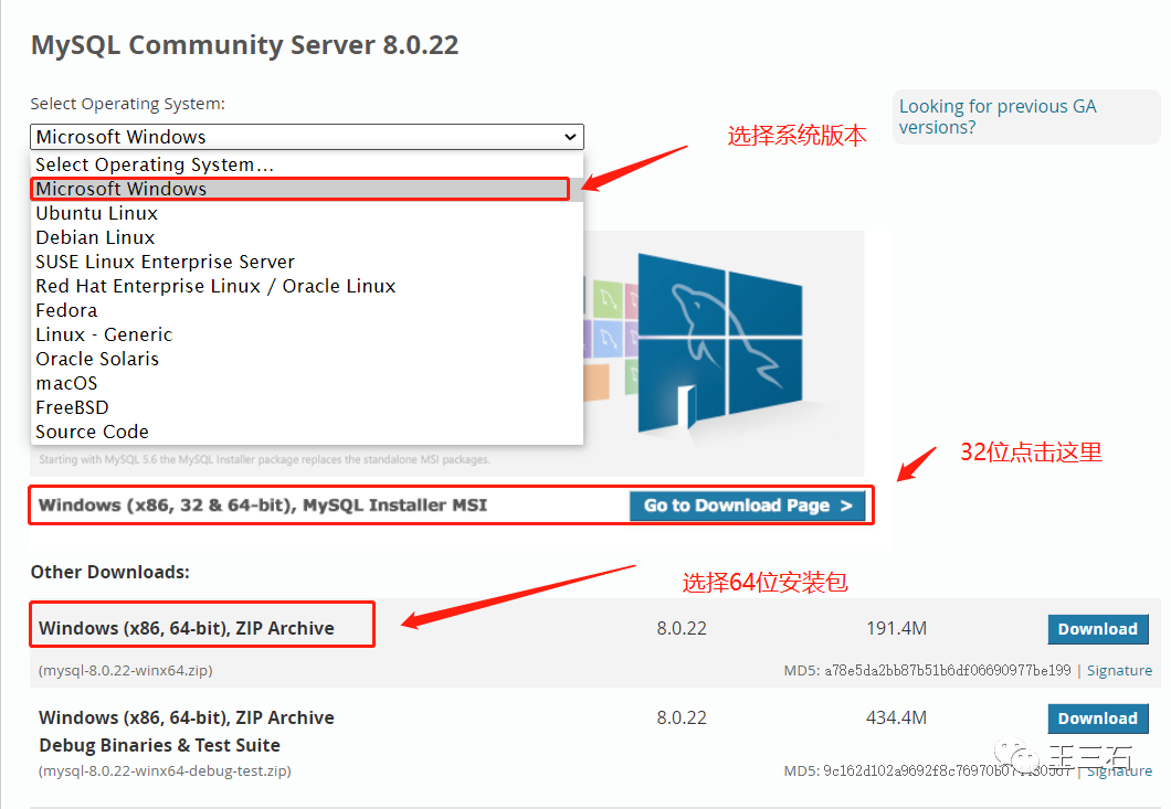下载地址:https://dev.mysql.com/downloads/mysql/