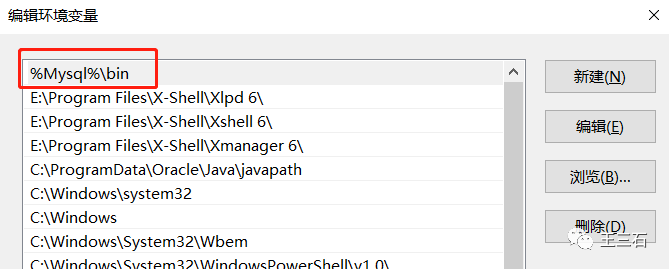 选择Path变量点击编辑,新建:%Mysql%\bin