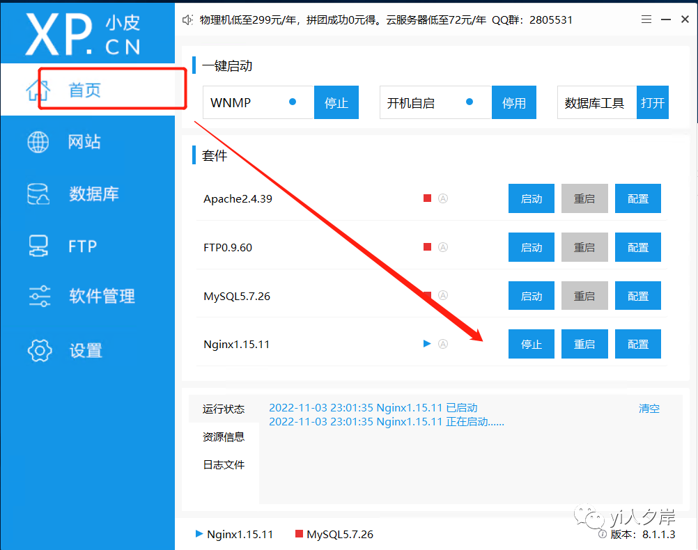 在首页启动Nginx(也可以使用Apache)