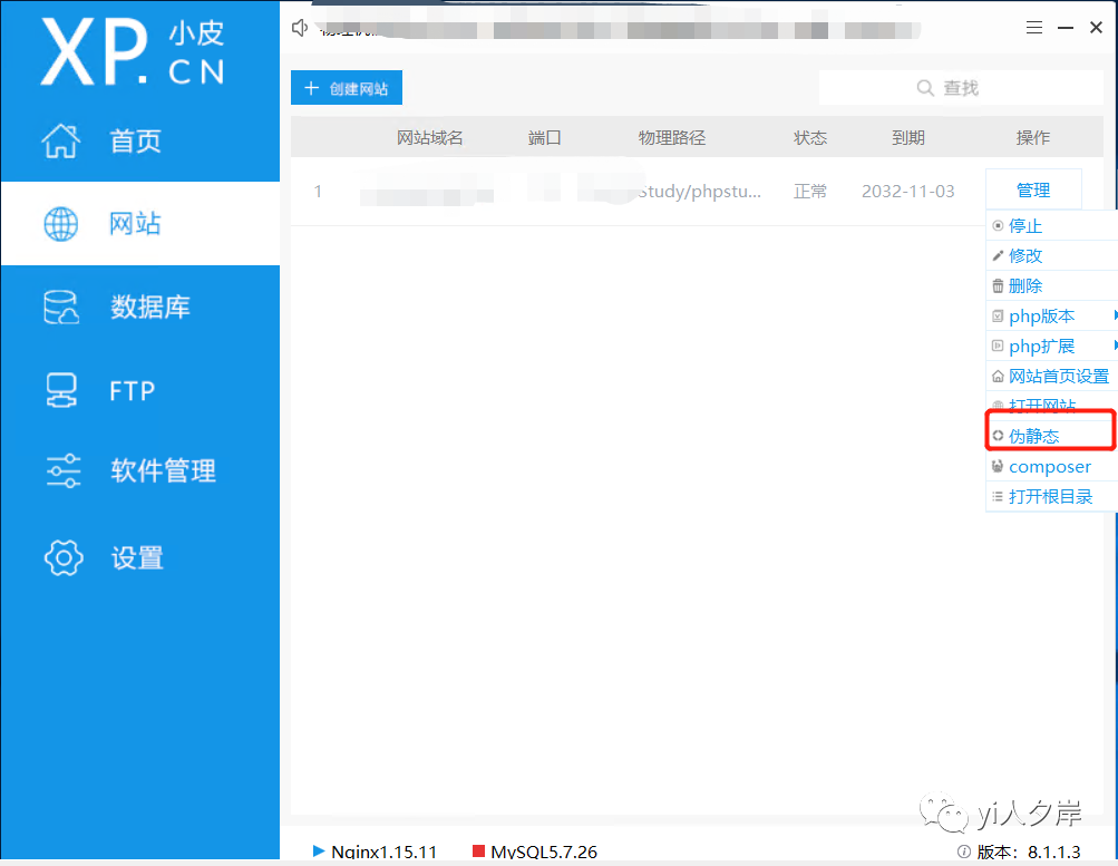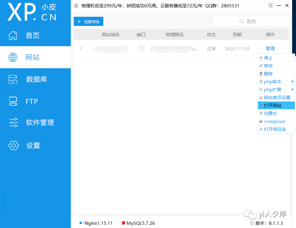 启动服务后,点击网站,安装后默认有一个本地网站,点击管理-->打开网站