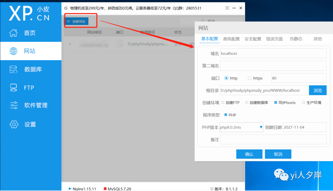创建网站 打开小皮,在网站中点击创建网站,在弹出配置窗口中进行配置(如下图) 首先配置网站域名,没有域名可以设置为localhost,端口默认与Nginx端口一致 端口可选http或https,配置https的时候,会弹出窗体输入公钥和密钥,这里直接选择http。 勾选同步hosts,程序类型选择PHP,版本选择php8.0.2nts 到期时间可自己调整