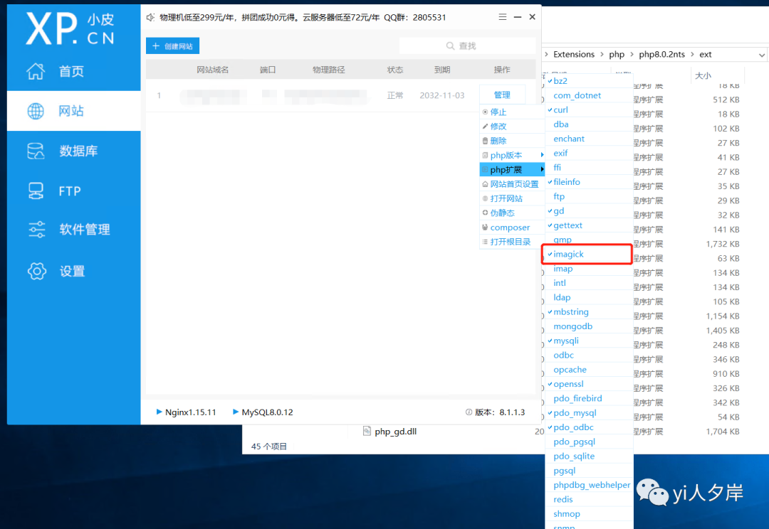 不出意外的情况下会提示缺少imagick扩展,只需要到官网下载与当前PHP版本符合的扩展文件就好,下载地址https://windows.php.net/downloads/pecl/releases/imagick/将下载的压缩i包解压,找到里面的php_imagick.dll文件,将他拷贝到小皮安装目录下..\Extensions\php\php8.0.2nts\ext文件夹里 然后打开小皮面板,选择网站,在扩展中勾选imagick,重启服务即可