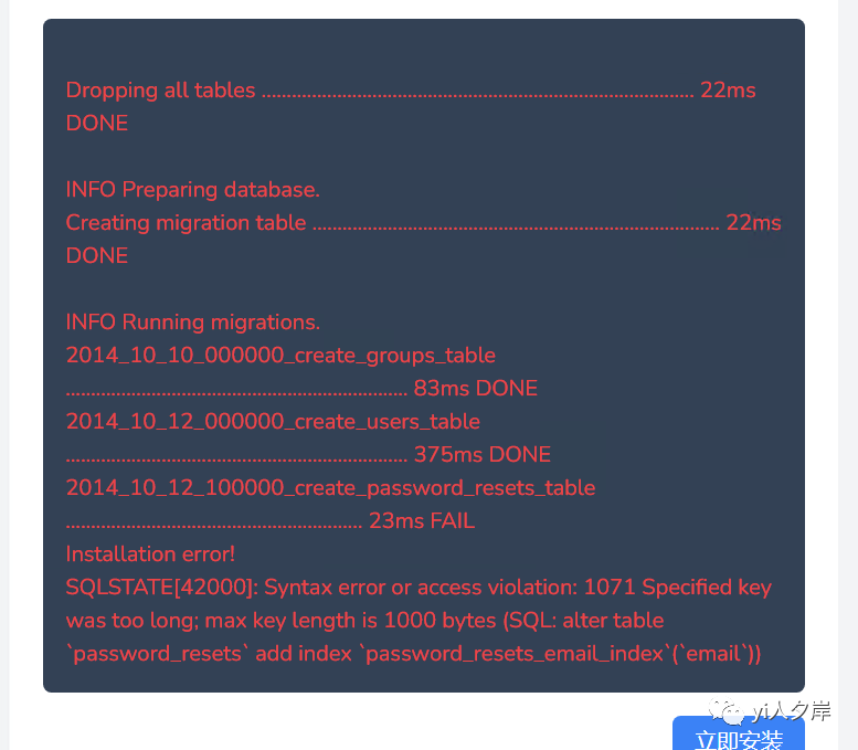 该原因是因为Mysql数据库字符串数据类型最大1000字节,laravel建表时字符串最大1071字节,主要是由于laravel用的是utf8mb4 字符集,每个字符占4个字节,Mysql用的是utf8字符集,每个字符占3个字节。