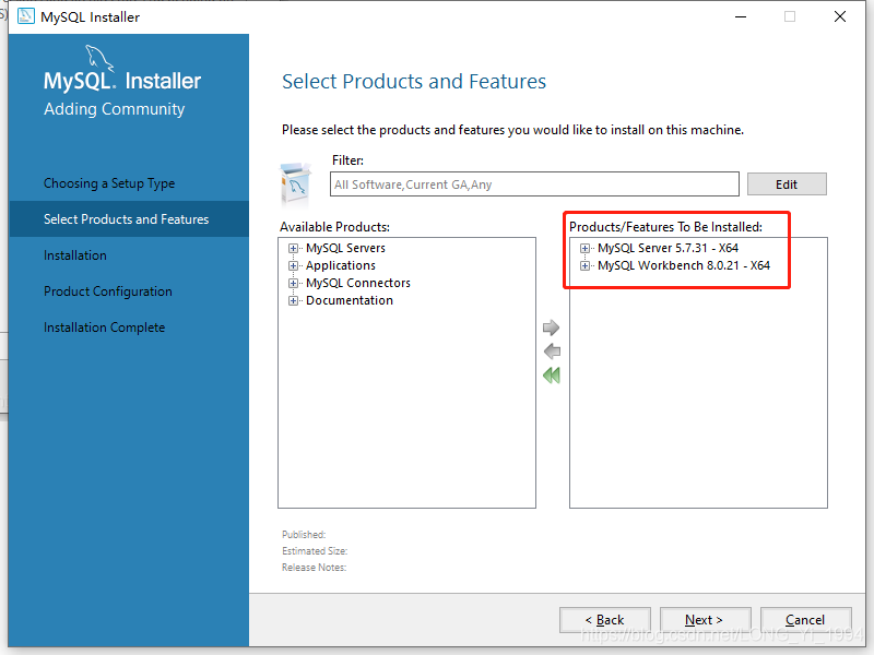 在产品选择页面里,选择适合自己的产品版本,MySQL Server是MySQL数据库服务器,MySQL Workbench是MySQL图形化管理界面,这里我分别选择了5.7和8.0.21版本。