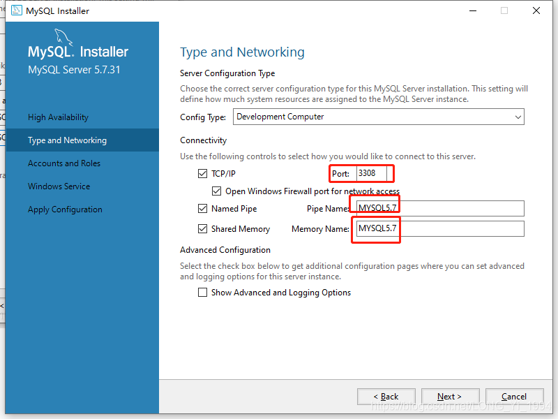 单击下一步,进入到配置页面,这里我将端口号改成了3308,相关服务名称(Named Pipe和Shard Memory)改成了MySQL5.7,一台电脑可以安装多个版本的MySQL,只要端口号和相关服务名称不一样就可以了。