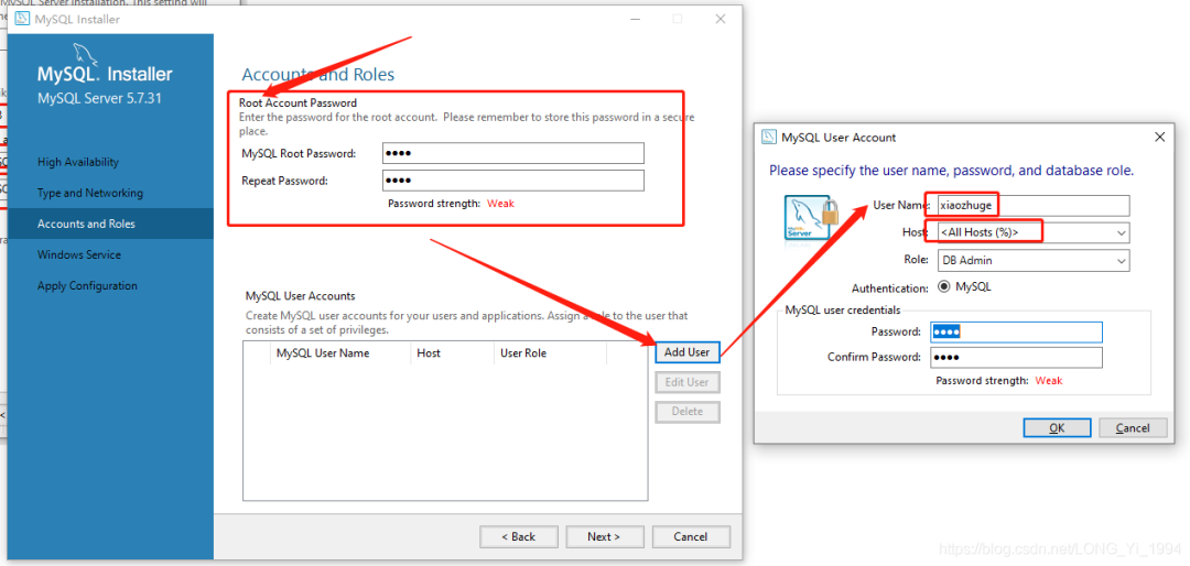 然后添加一个MySQL用户(也可以不添加,直接使用MySQL的root用户,但为了安全,最好添加一个MySQL用户),并为该用户设置用户名、用户主机(Host的值设为All Hosts(%)表示该用户可以从任何电脑通过ip连接该MySQL,如果设为localhost,则该用户只能在此电脑上连接MySQL,在其他电脑是不允许连接这个MySQL的)、角色、密码。