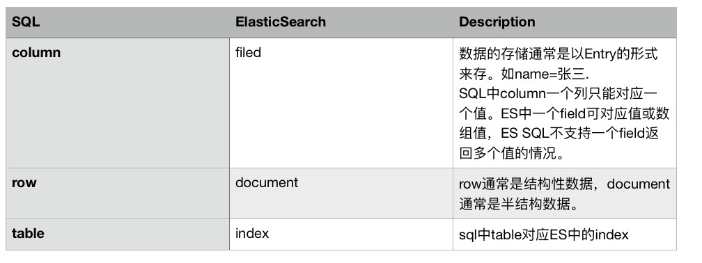 首先需要了解下ES SQL支持的SQL语句中,SQL术语和ES术语的对应关系: