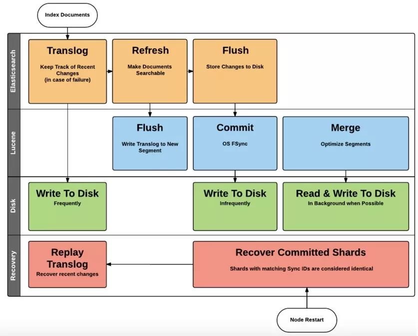 ES的写入性能可以很高(尤其是批量写入),取决于你的配置。一个文档要写入索引,直到读可见,要经过一系列的缓冲和合并。我们拿ES官方博客的一张图来说明。