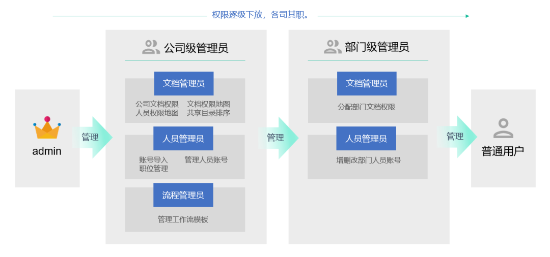 管理权限支持逐级下放,由各部门独立管理本部门文档权限、账号职位等,释放管理员的管理压力,也让权限设置、授权、管理更灵活。