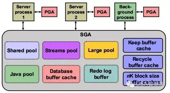 (1)SGA:System Global Area是Oracle Instance的基本组成部分,在实例启动时分配;系统全局域SGA主要由三部分构成:共享池、数据缓冲区、日志缓冲区。