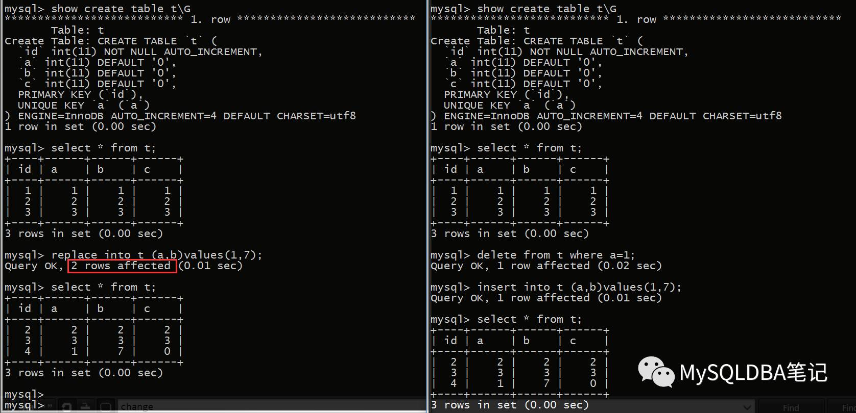 左侧使用 REPLACE 语句,右侧使用 DELETE + INSERT 语句,最后结果完全相同