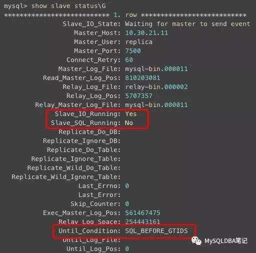 mysql> start slave until SQL_BEFORE_GTIDS='542ef021-9a64-11e5-bc49-025d3d22c211:1348360'; Query OK, 0 rows affected (0.00 sec)