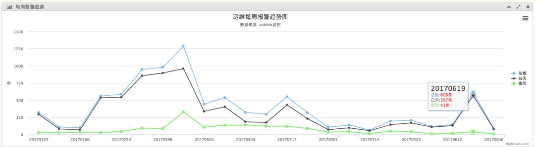 很直观的展示每周的报警数量,如果优化比较好的话,会看到整体应该是下降的趋势。