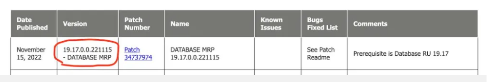 - 注意:MRP 19.17.0.0.221115 不包含任何 SQL 更改,因此不需要在安装后运行 datapatch。对于未来的 MRP,这可能会改变。