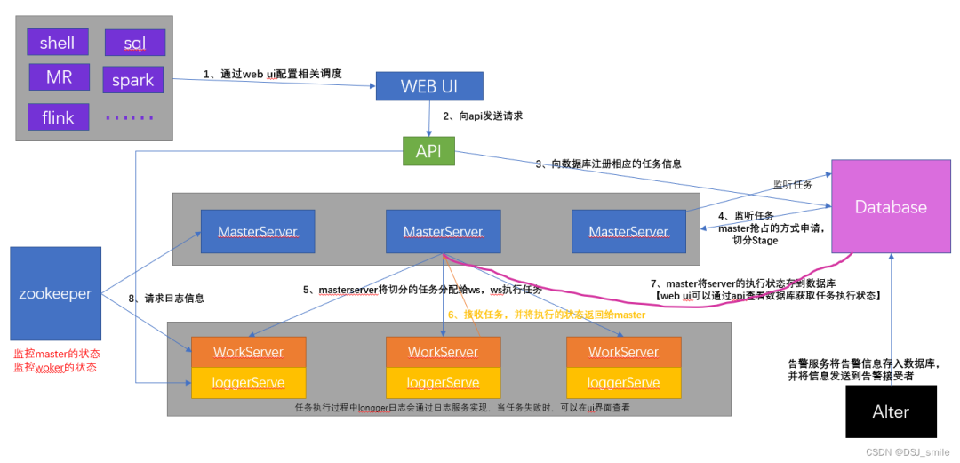 【MasterServer】:采用分布式无中心设计理念,MasterServer主要负责 DAG 任务切分、任务提交、任务监控,并同时监听其它MasterServer和WorkerServer的健康状态。