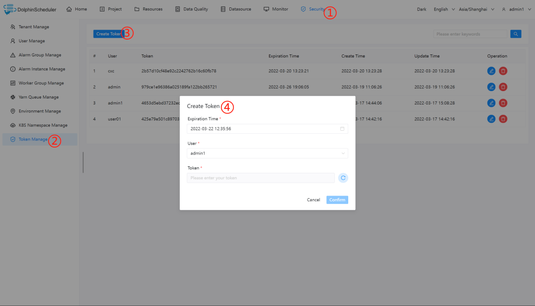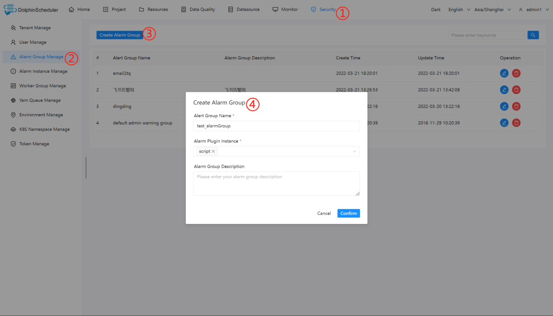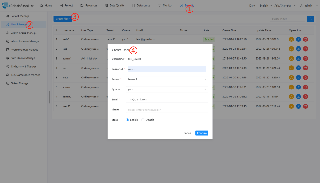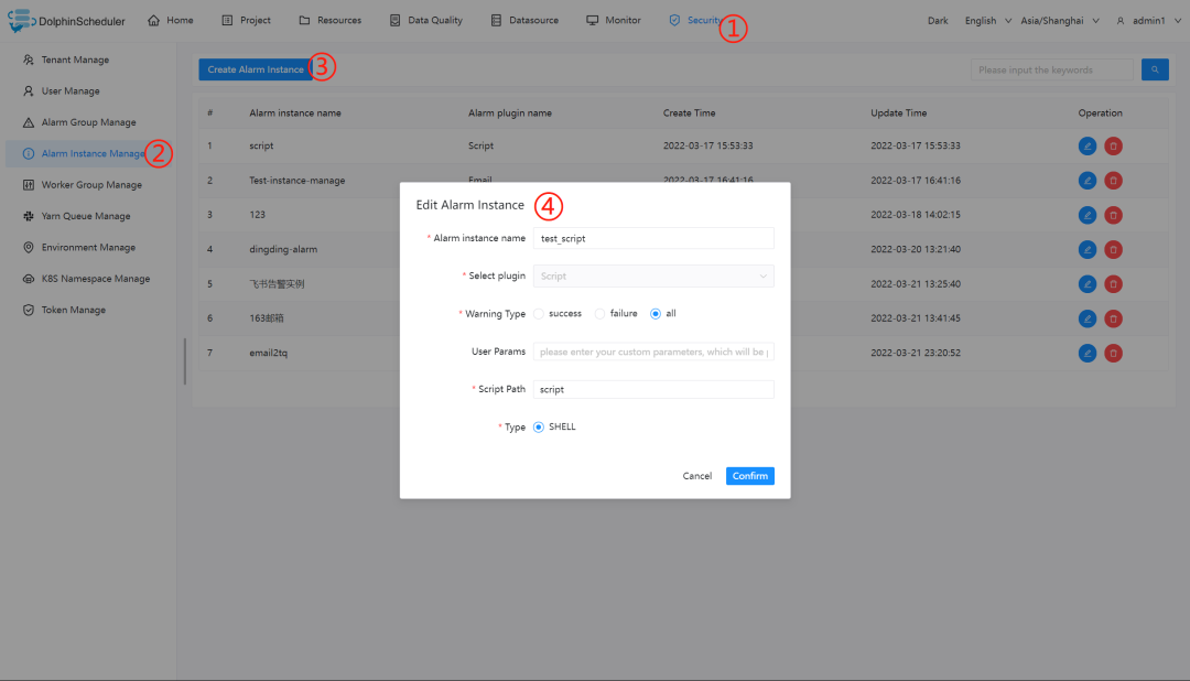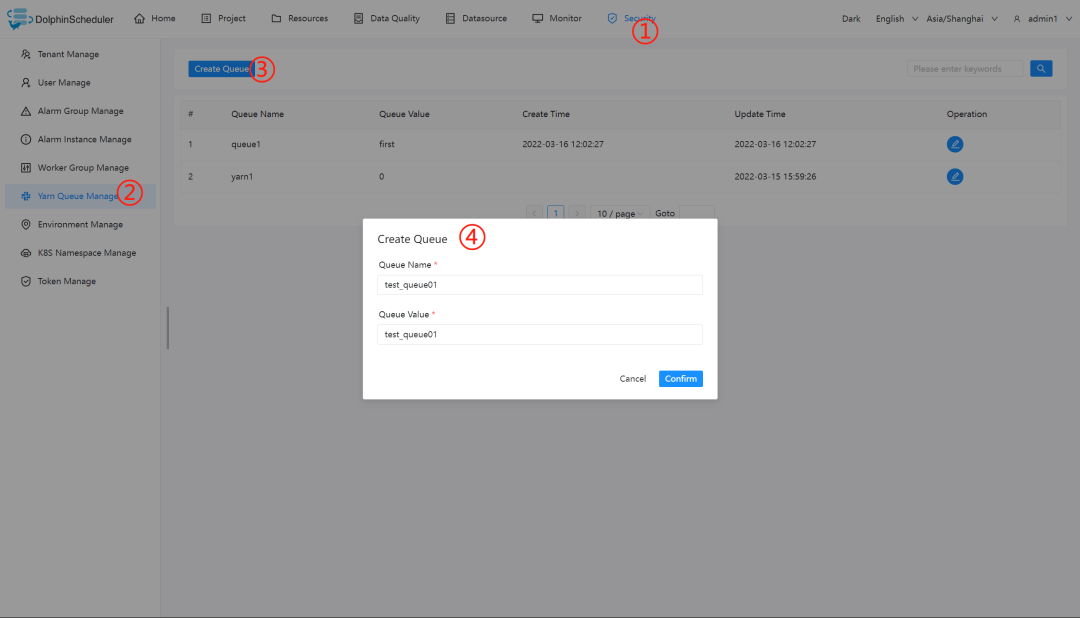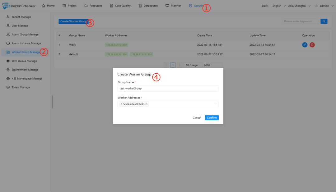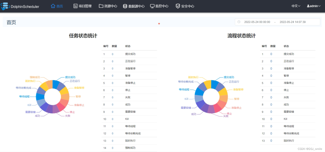 用户名/密码:admin/dolphinscheduler123