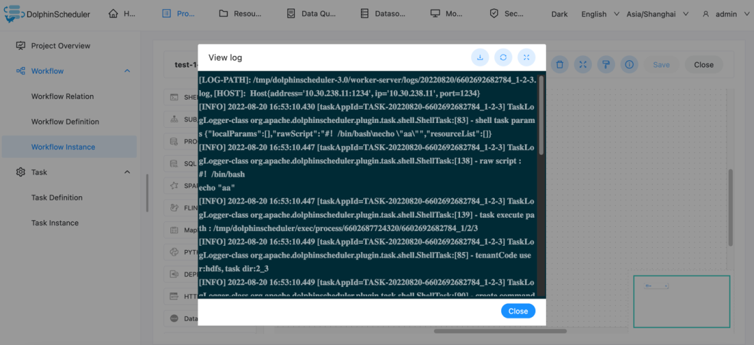 运行工作流定义->点击工作流实例->点击工作流实例名称->双击任务节点->查看任务执行日志