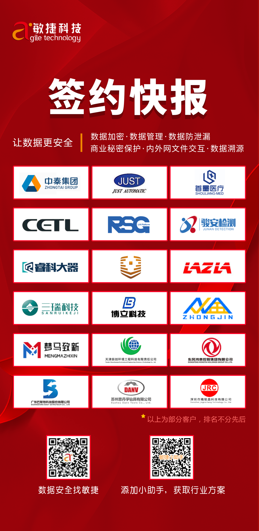 敏捷科技始终坚持以客户需求为导向,以“让数据更安全”为使命,基于卓越的产品、强大的研发实力和前沿的创新理念,为各行业用户提供稳定可靠、易用适用的数据安全系列产品及解决方案,打造最佳安全防护体验,构建安全、高效的网络化、信息化、数字化办公环境,为企业构筑数字化转型的数据安全底座!