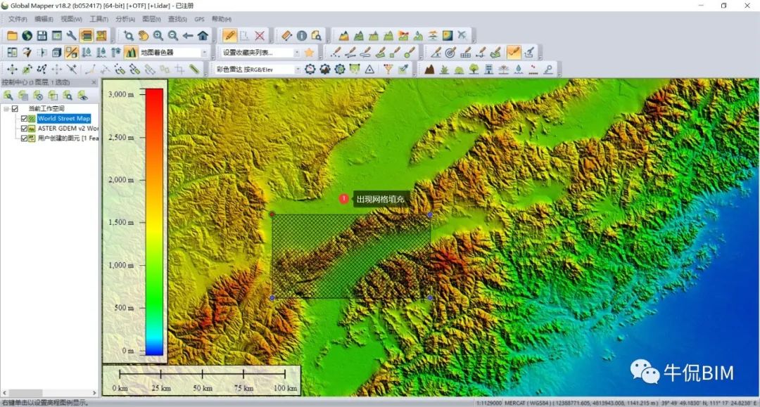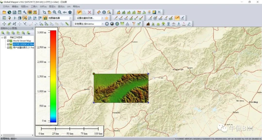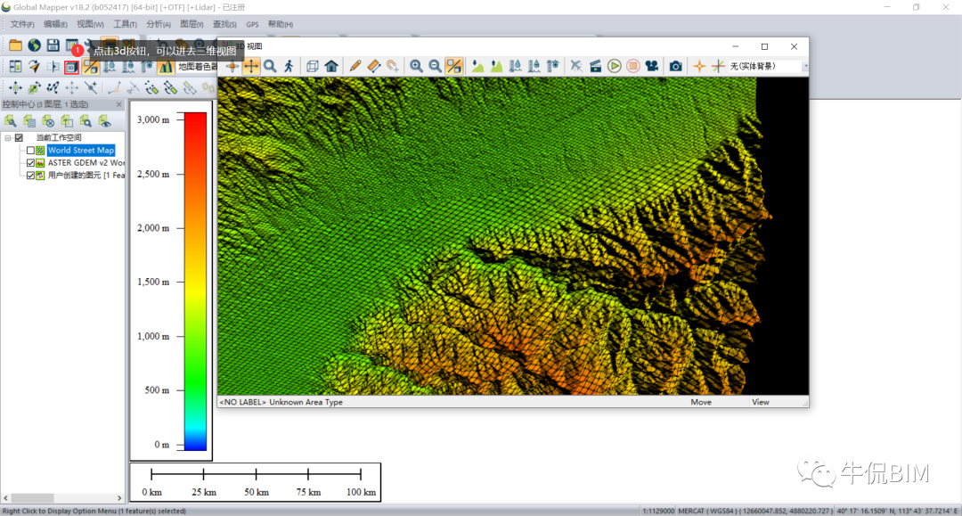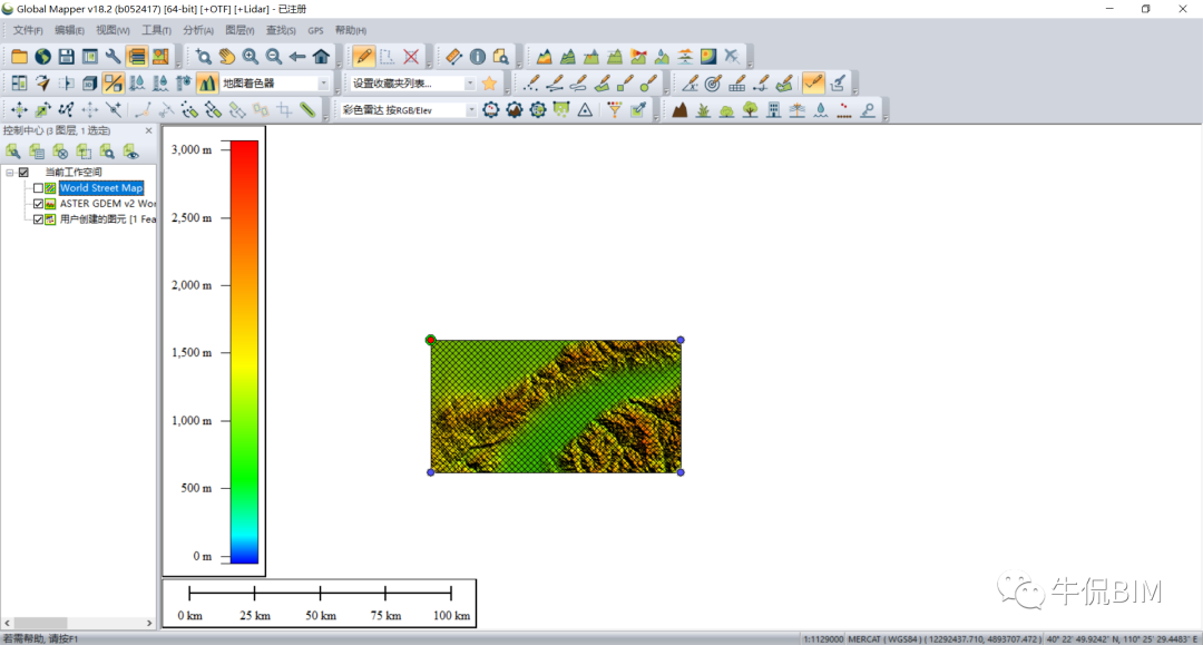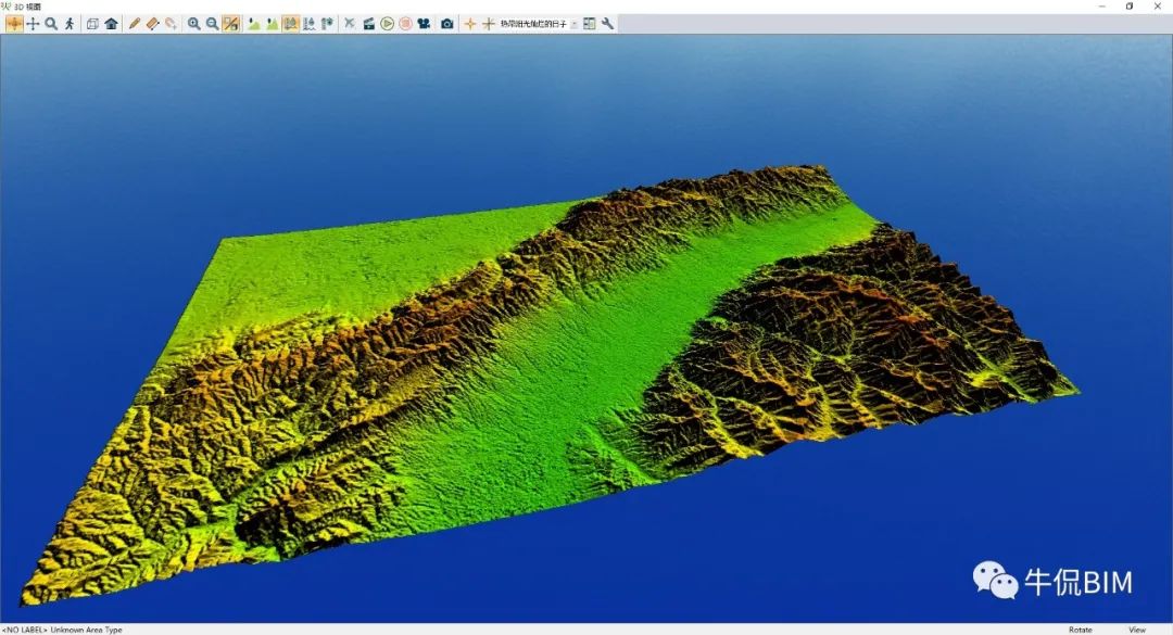 ➤几秒后会出现如下视图(具体时间有网速决定),不同的高程用不同的颜色表达出来了: