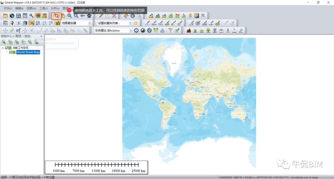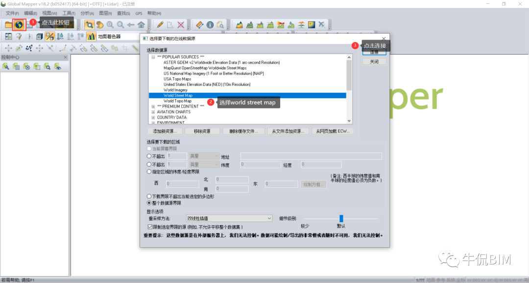 ➤点击上方地球按钮,选择world street map,点击连接,获取全球地理数据。