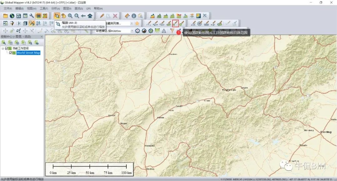 ➤使用框选放大工具选择到具体的地形范围,此处我选择到的是山西省某贫困山区: