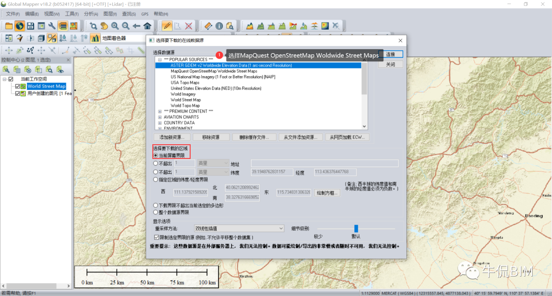 ➤再次点击小地球按钮,本次我们要获取到之前框选区域的高程数据,选择MapQuest OpenStreetMap Woldwide Street Maps,勾选当前屏幕界限(加载范围为当前屏幕显示的部分),点击连接。