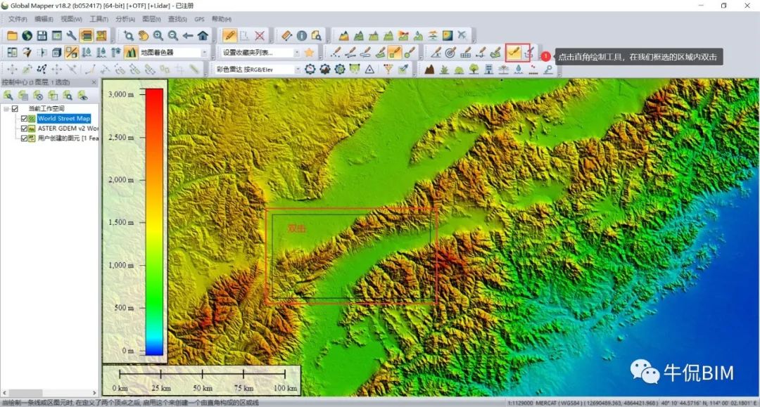 ➤接下来使用直角绘制工具,双击我们框选的区域: