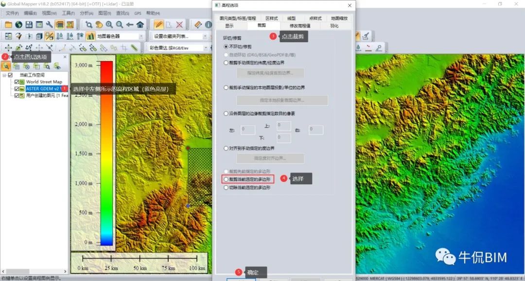 ➤选择我们的高程区域,点击图层显示选项,点击裁剪,勾选裁剪当前选中多边形: