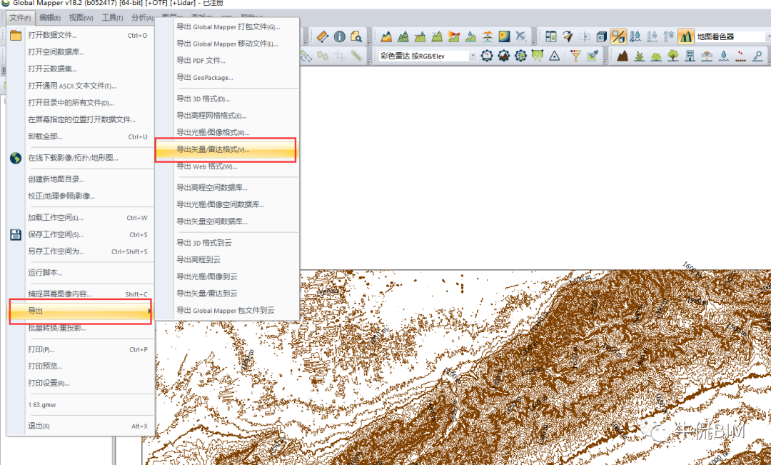 ➤回到Global Mapper软件中,我们可以将三维地形导出为其他格式的文件此处我们使用dxf: