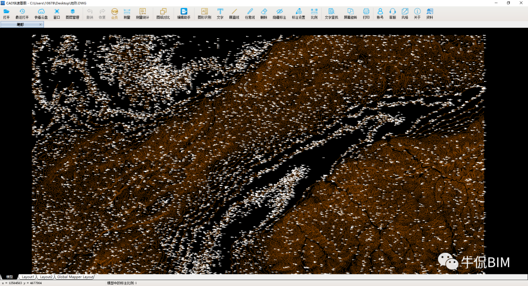 ➤导出完毕之后我们可以先使用CAD或者快速看图工具看一下导出的等高线: