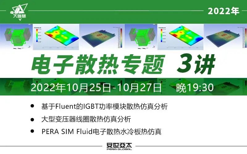 2022年10月25日-27日,安世亚太大咖慧推出电子散热专题仿真免费线上培训,专题讲座包含:IGBT、大型变压器线圈、水冷板(PERA SIM)热仿真,不容错过。