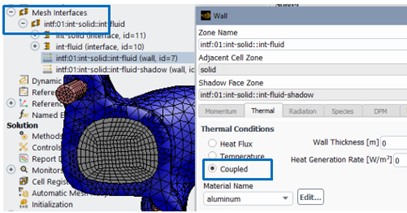 对于共轭换热模拟,流体和固体交界面会自动应用耦合热边界条件,也就是说图7中的Tw = Twf = Tws,通过壁面每一侧的热通量自动平衡。如果耦合壁面为一致网格,会自动生成耦合的wall/wall_shadow;如果为非一致耦合壁面,需要通过Setup→Mesh Interfaces,手动或自动创建交界面,固体域与流体域或者两个固体域之间的非一致交界面,自动应用耦合壁面条件。