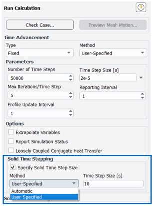 1)固体时间步进(Solid Time Stepping)。指定固体时间步长,大于流体使用的时间步,包括Automatic、User-Specified两种方法,其中自动方法是根据固体的物理性质估算时间尺度,并根据固体体积估计特征长度尺度。需要注意的是,如果需要获取的是耦合系统实时精确的瞬态解,那么固体和流体的时间步长应相等。