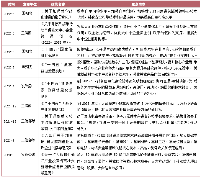 外部环境:中美形势复杂严峻,科技硬脱钩持续。近期以来,美国接连签署“芯片法案”、“通胀消减法案”,旨在抑制中国相关产业发展,呈现逆全球化的趋势。外部环境不确定性加剧,信创重要性凸显。信创作为国家战略布局,一方面有利于保障我们软硬件供应链的安全,另一方面有利于我国核心软硬件企业的发展,助力核心数字产业升级壮大。
