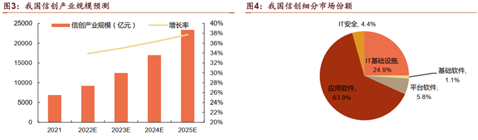 市场空间:预计25年信创产业规模突破2万亿。21年我国信创产业规模为6886.3亿元,随着国产替代进程的深入和应用场景的丰富,我们预计接下来五年信创市场进入高速发展期。