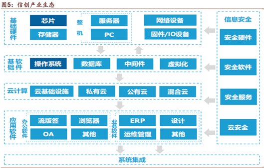 我国信创软硬件生态已初步建立。信创产业生态主要由底层硬件、基础软件、平台软件、应用软件、信息安全组成。