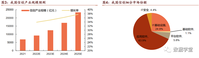 预计2025年信创产业规模突破2万亿,2021年应用软件市场份额超60%。21年我国信创产业规模为6886.3亿元,随着国产替代进程的深入和应用场景的扩大,根据海比研究院报告,接下来五年信创市场进入高速发展期,25年市场规模突破2万亿。